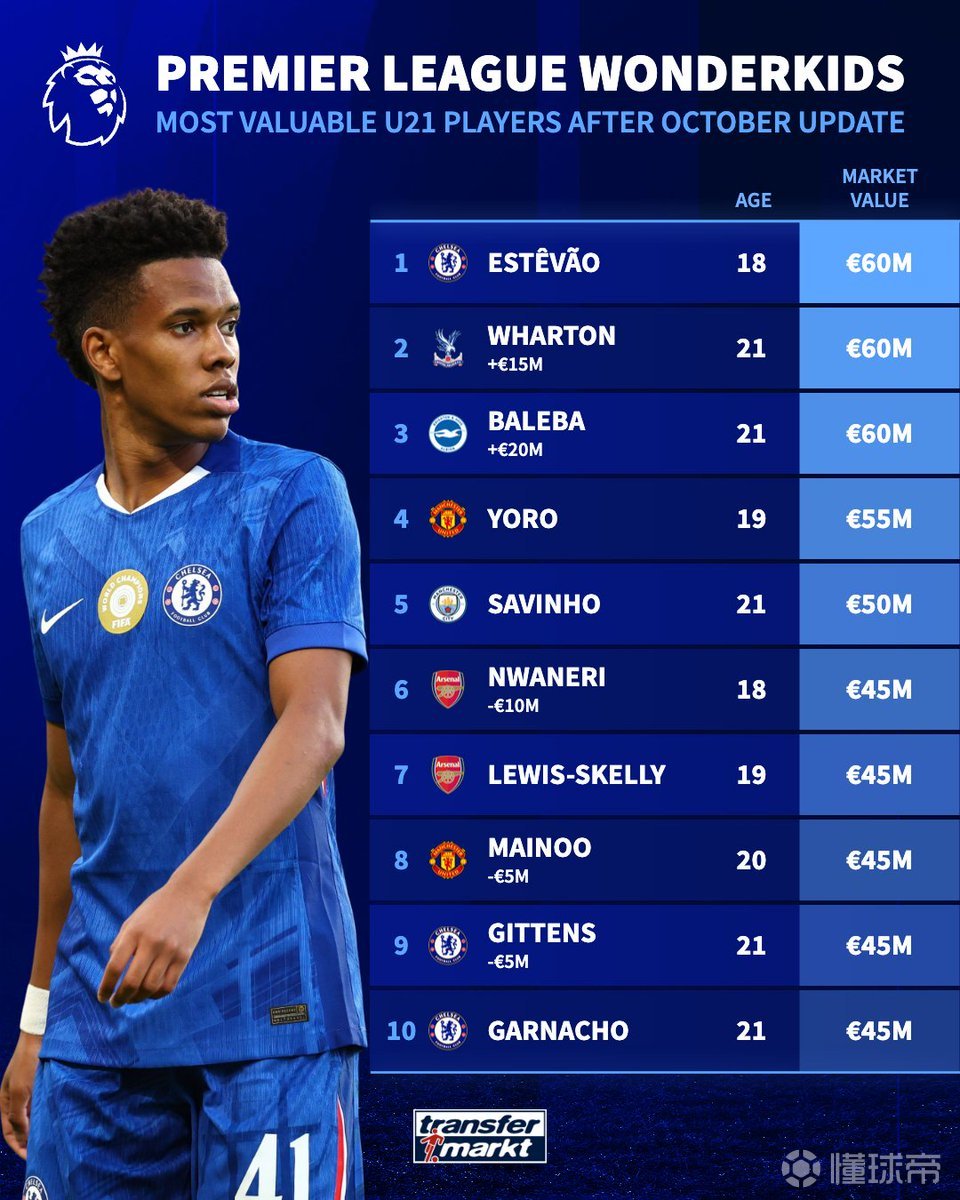 英超U21球员身价排行:埃斯特旺、沃顿、巴莱巴6000万欧居首